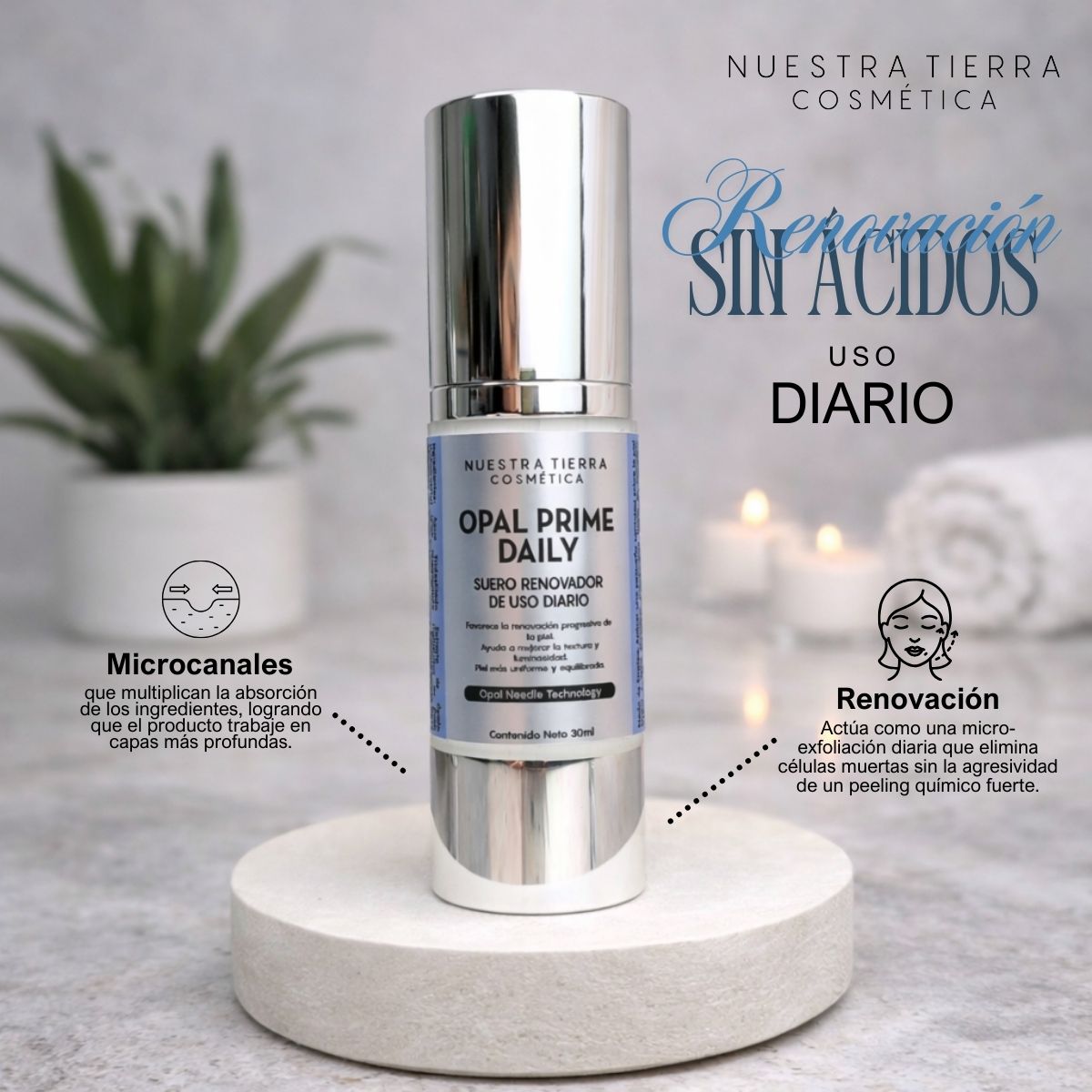 En esta fórmula cremosa pero ligera y sin residuos grasos utilizamos Opal Needle Technology™ una tecnología de microagujas de sílice, inspiradas en la geometría mineral del ópalo, diseñadas para interactuar de forma controlada con la epidermis.