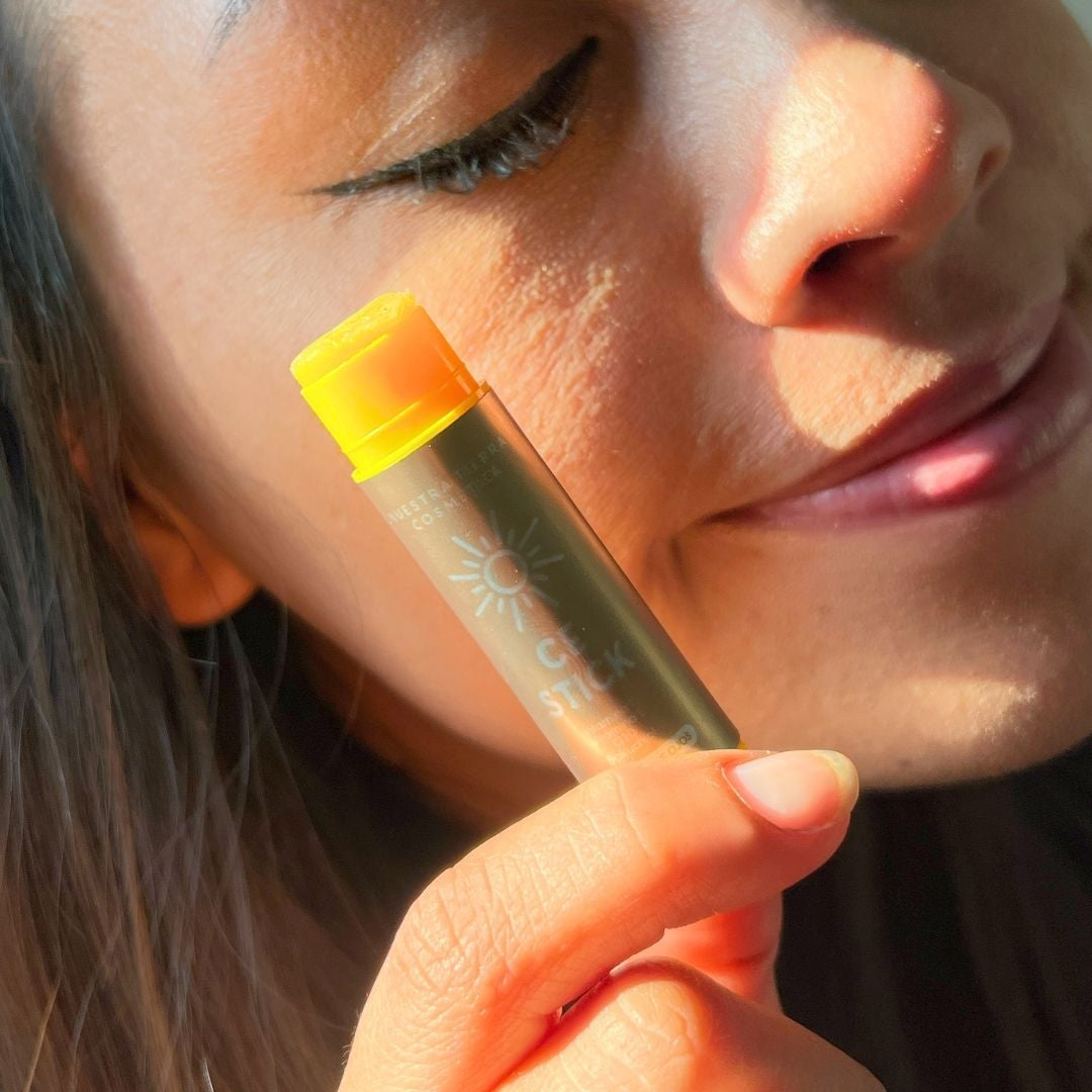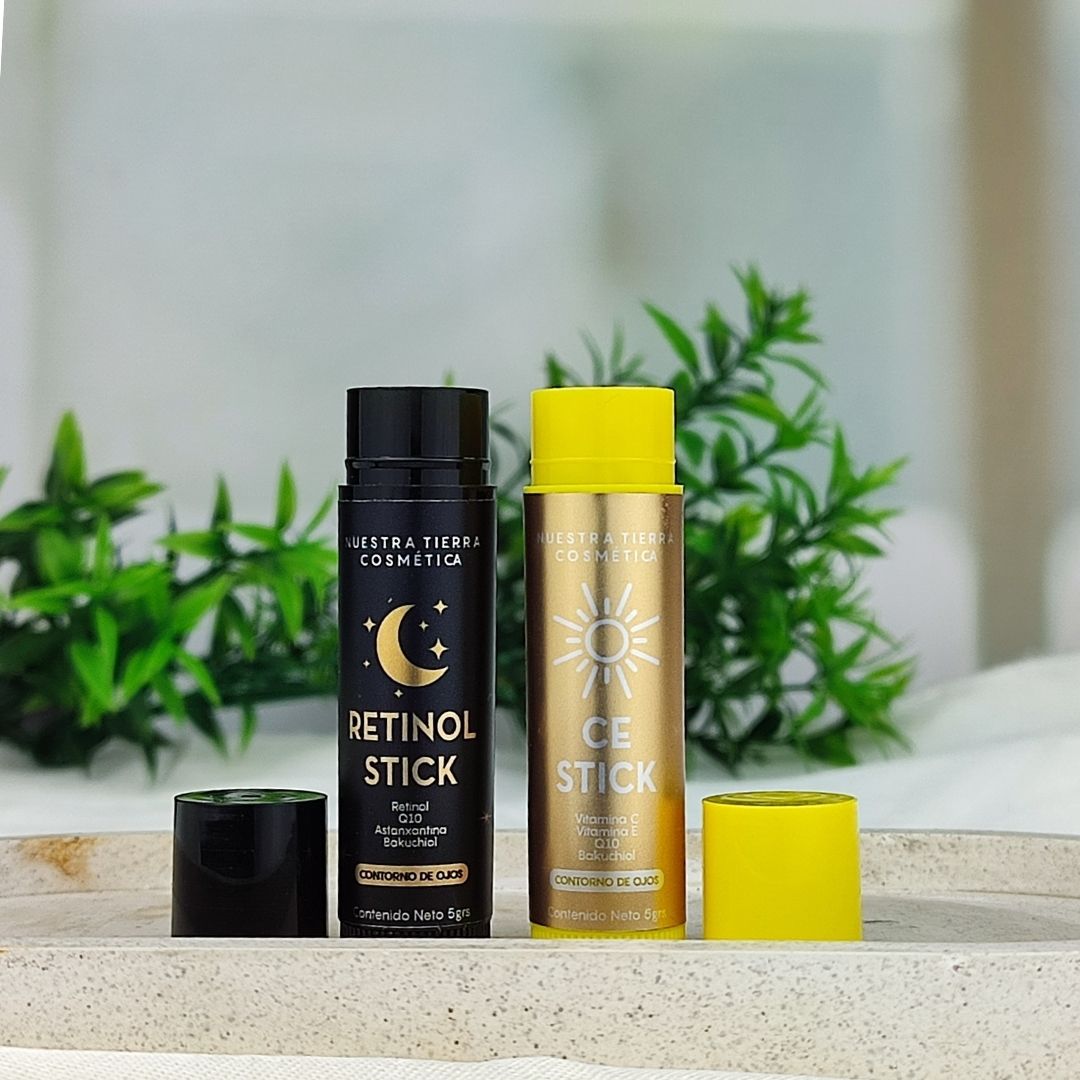 El Retinol Stick (uso nocturno) une Retinol, Bakuchiol, Astaxantina y Coenzima Q10 en una fórmula nutritiva con Manteca de Karité, Escualeno de Oliva y Rosa Mosqueta, que estimula la renovación celular y suaviza líneas finas mientras duermes.