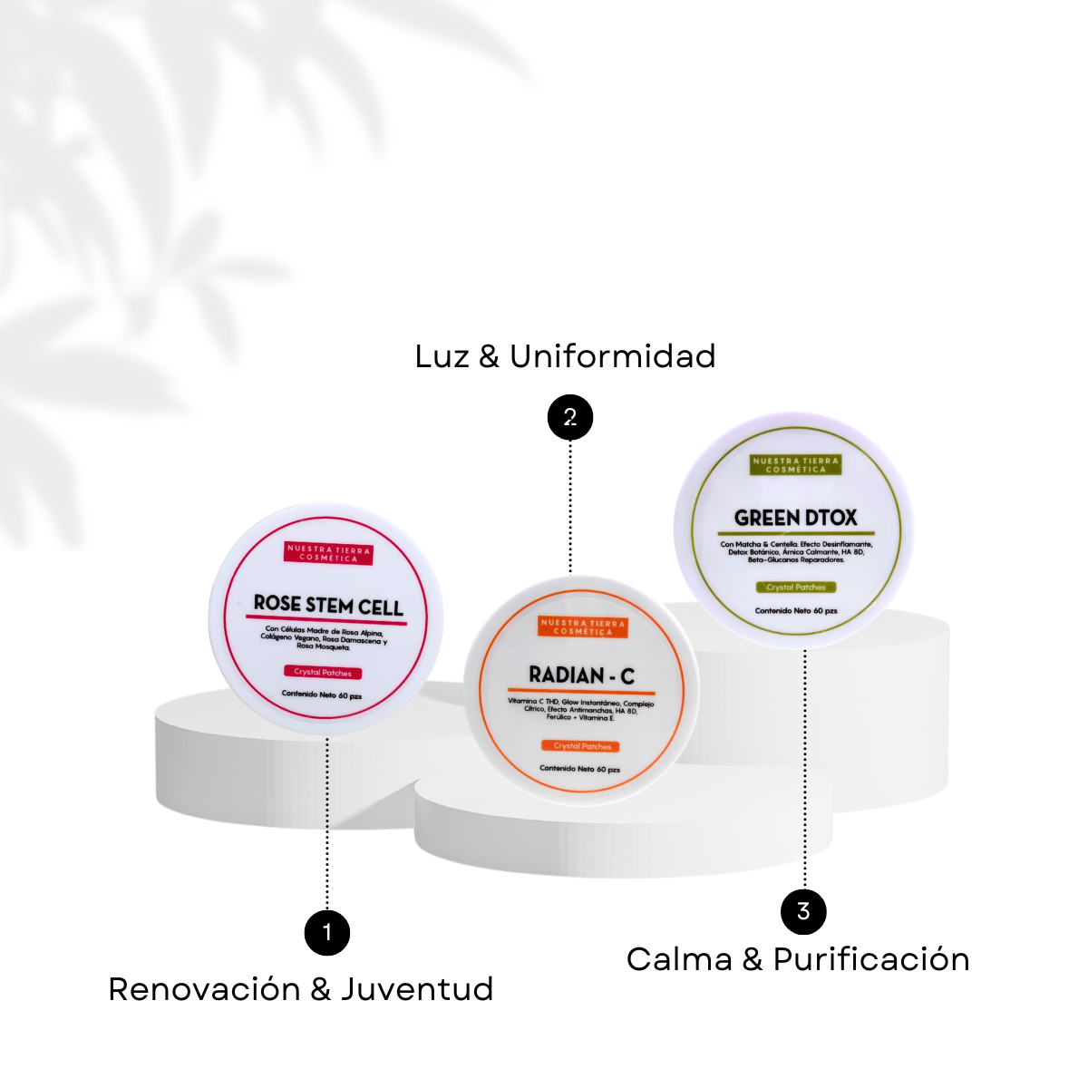 La Trilogía de la Luz reúne los Crystal Patches Rose Stem Cell, Radian C y Green Dtox en un pack exclusivo que hidrata, ilumina, desinflama y renueva la piel desde distintos espectros botánicos y biotecnológicos.