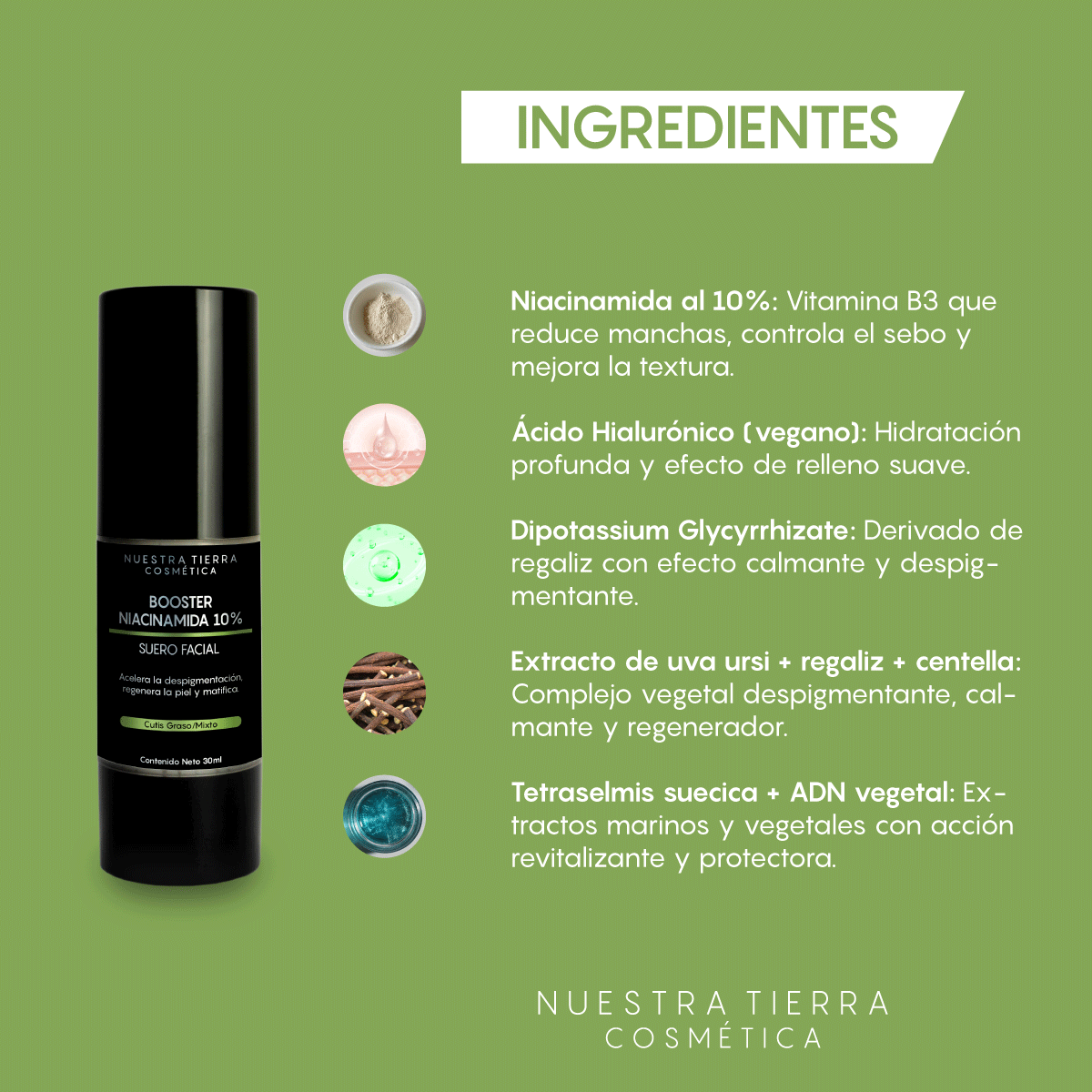Formulamos este Booster con 10% de Niacinamida de Alta Pureza, un poderoso ingrediente que ayuda a aclarar la piel, reduce las manchas de la edad, manchas solares, manchas rojas y manchas amarillas (piel cetrina) mejorando el tono de la piel de forma global, brindándole una luminosidad natural y saludable.