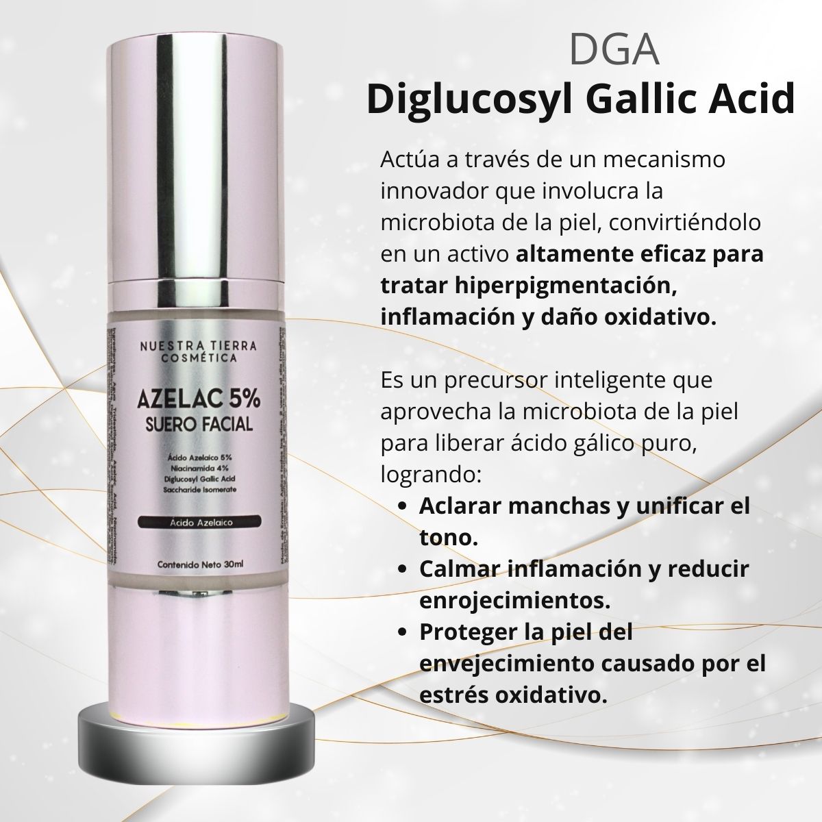 Tenemos un Booster con 10% de este ácido pero si es la primera vez que vas a utilizarlo requiere de un tiempo de adaptación por ello creamos este suero al 5% y potenciamos su fórmula con Diglucosyl Gallic Acid una molécula melano-reguladora de nueva generación que es activada por el microbioma (la enorme cantidad de microorganismos que viven en simbiosis con nuestra piel) y la cual restaura un tono de piel perfecto y uniforme al bloquear el proceso de melanogénesis en varios niveles, controlando así el oscurecimiento de la piel y reduciendo las manchas pigmentarias.