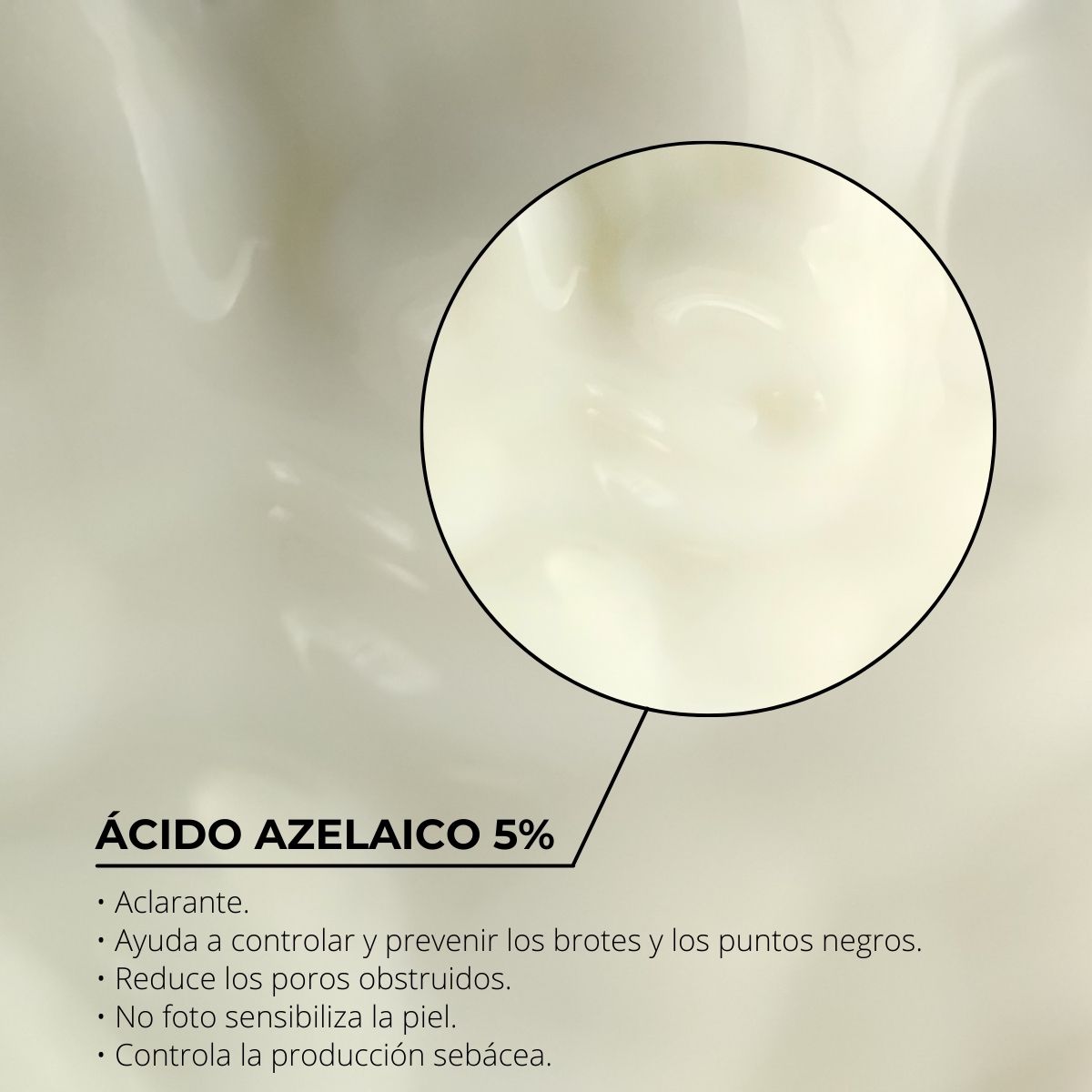 El Ácido Azelaico es un activo de origen natural que “desvanece” los melanocitos (células que producen el pigmento que le da color a la piel llamado melanina) que funcionan de forma anormal o hiperactiva sin afectar a las células sanas lo cual es ideal en casos de melasma, cloasma así como en las hiperpigmentaciones post-inflamatorias que se desarrollan debido al acné, el herpes zóster, las quemaduras (mecánicas y químicas) y los daños en la piel.