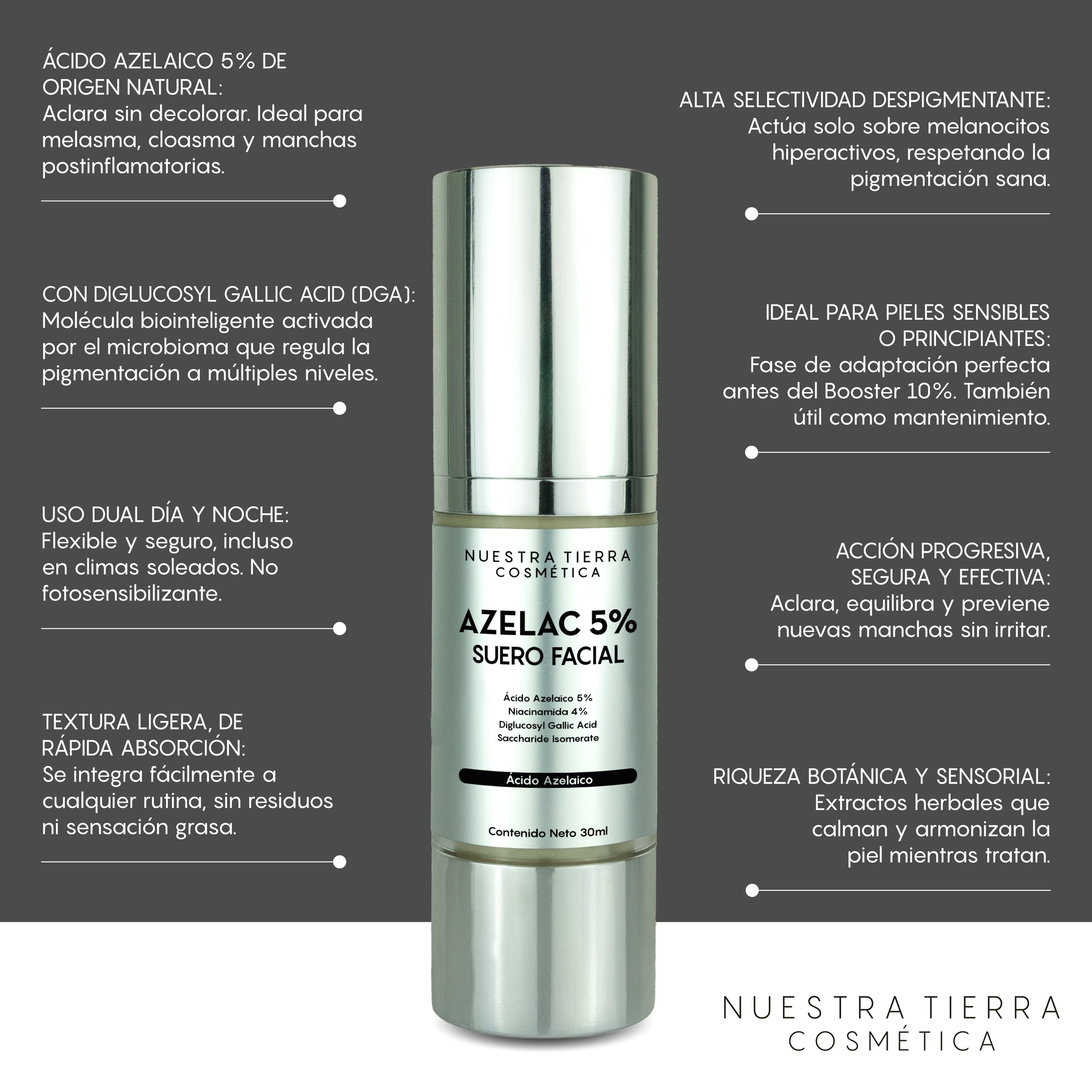 Azelac 5% se puede utilizar tanto de día como de noche, la adaptación de la piel a este suero es más rápida que al Booster con Azelaico al 10% así que es una alternativa para pieles sensibles o bien como mantenimiento si ya has utilizado el Booster.