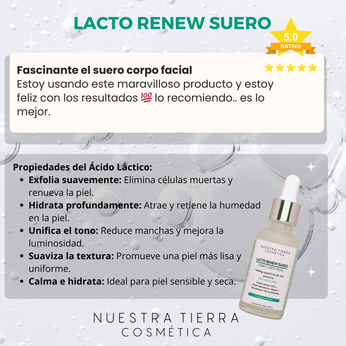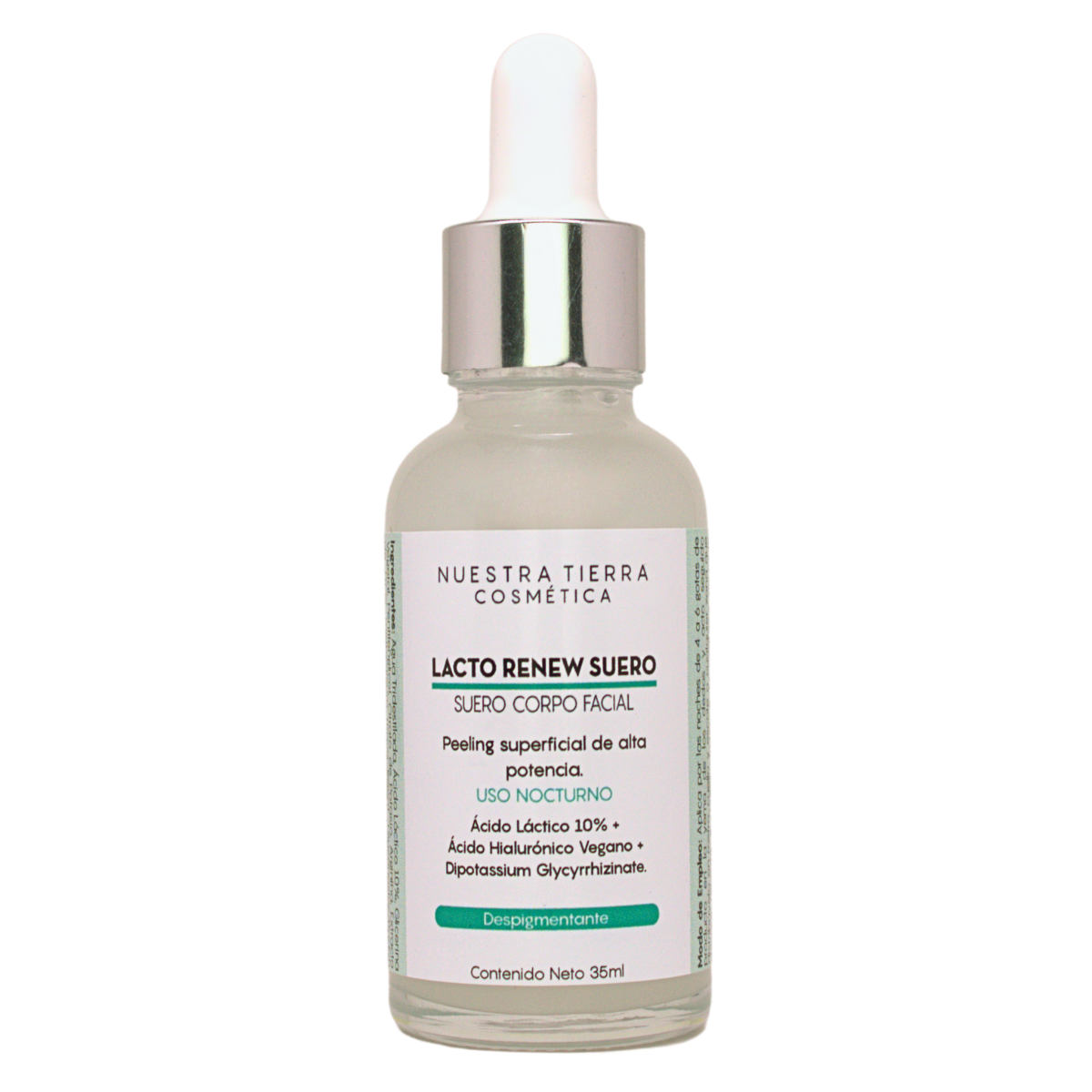 Suero Corpo Facial con Ácido Láctico de origen vegetal que brinda un Peeling superficial de alta potencia el cual ayuda a lograr una piel más clara, uniforme y con mejor textura.