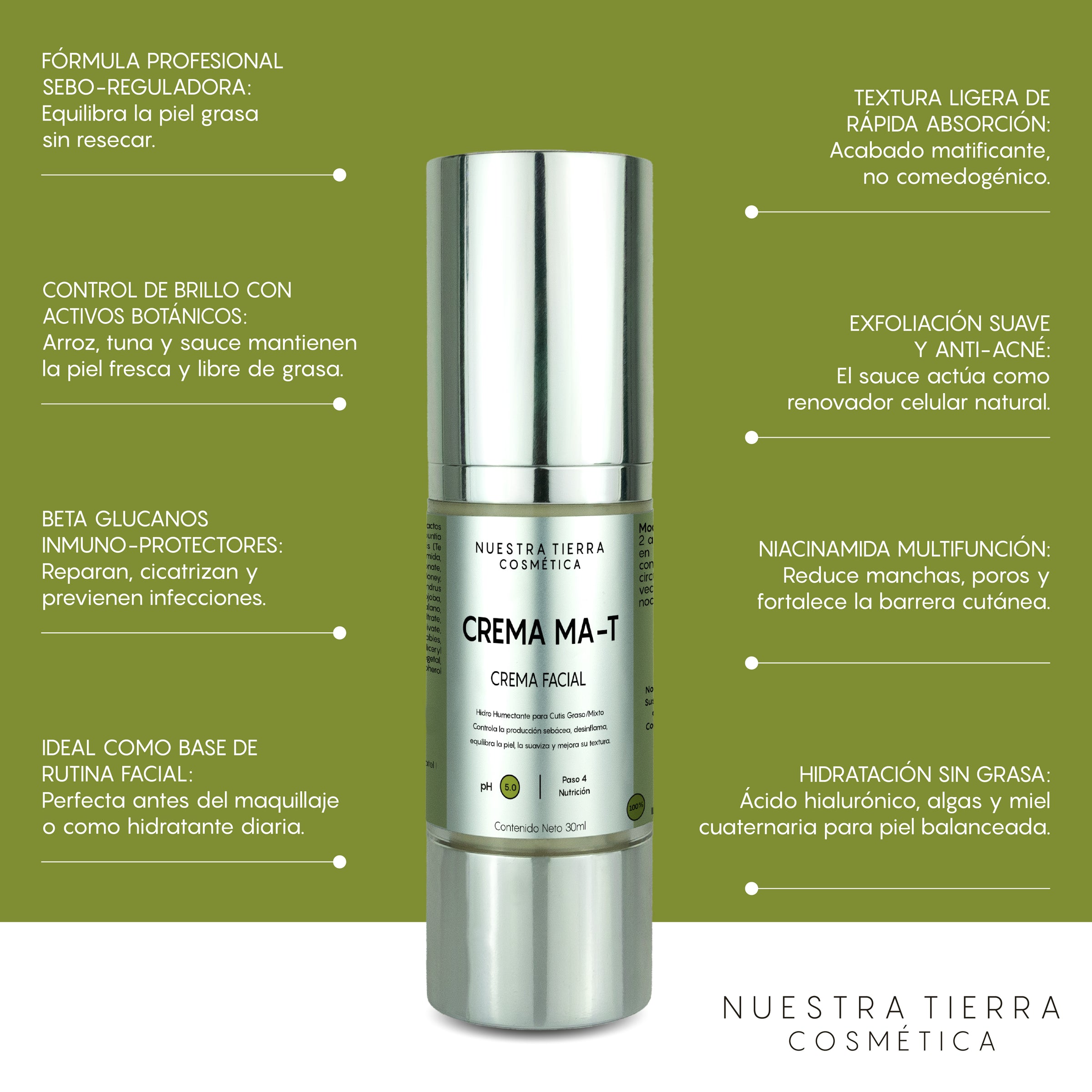 La CREMA MA-T no solo matifica, sino que también nutre y revitaliza tu cutis, ofreciendo una experiencia de cuidado completa y equilibrada es ideal para usar a diario pues es la aliada perfecta para una piel saludable, libre de brillo y llena de vitalidad.