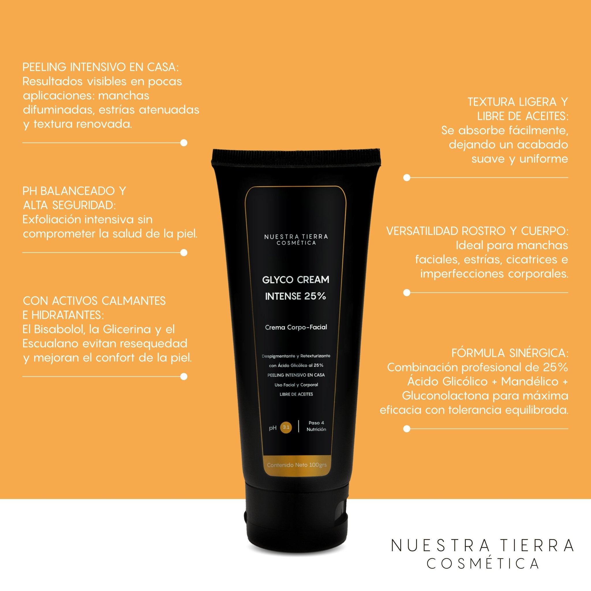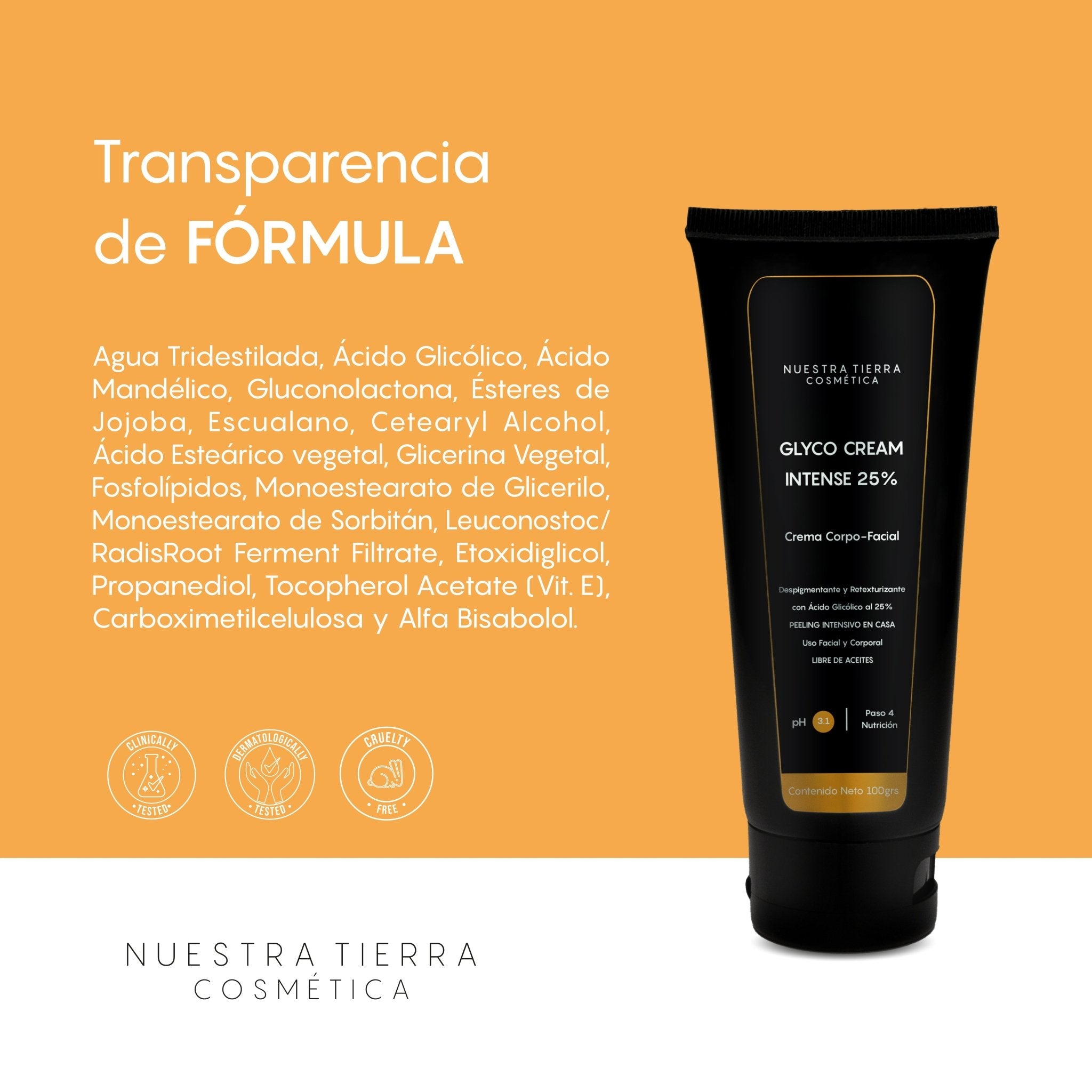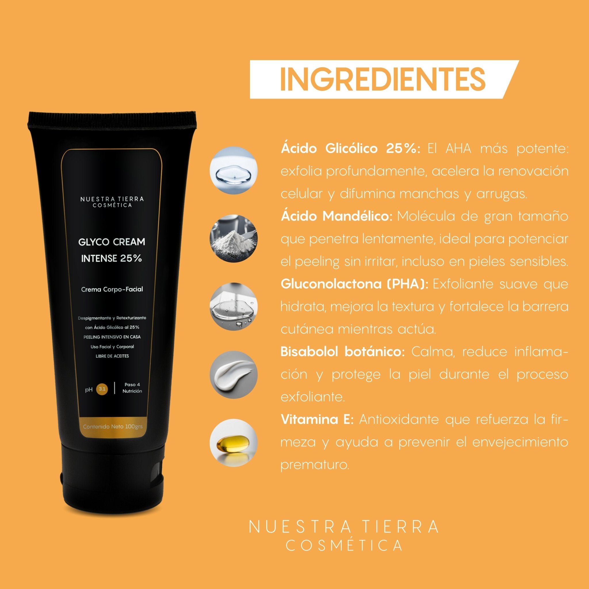 GLYCO CREAM INTENSE tiene un pH que brinda un perfecto equilibrio entre la eficacia del tratamiento y la tolerancia de la piel además esta adicionada con Bisabolol un ingrediente que calma la piel y reduce la inflamación asegurando que tu piel se mantenga hidratada y confortable durante el tratamiento.
