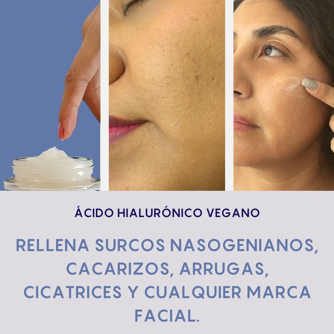 Su contenido de Ácido Hialurónico Vegano de alto y bajo peso molecular ayuda a hidratar todas las capas de la piel y darle un efecto Plump (una bomba de hidratación en la piel que se traduce en una redensificación de la misma).