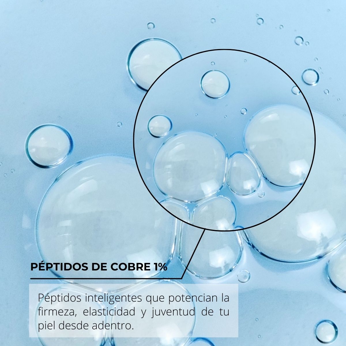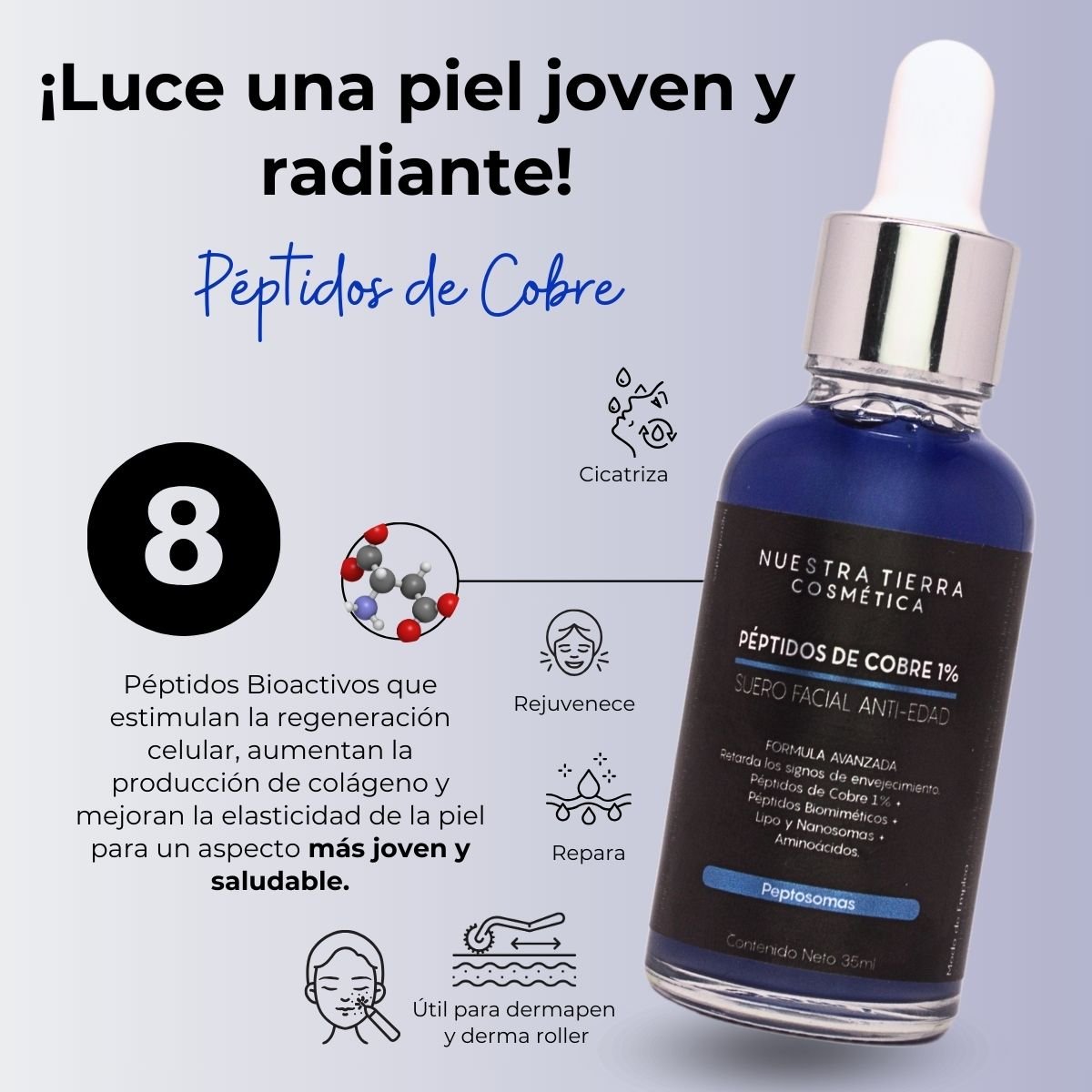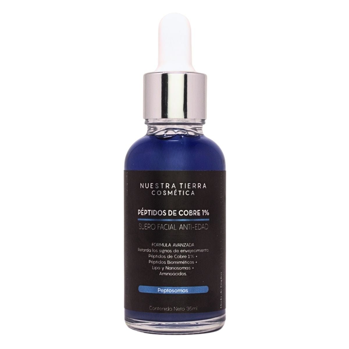 Suero Anti-Edad base agua, de rápida absorción, libre de aromas y colorantes sintéticos; su bellísimo y atractivo color se debe a los Péptidos de Cobre presentes en esta fórmula al 1% sumados a Péptidos Biomiméticos, Aminoácidos, Adenosina, Lipo y Nanosomas logrando una poderosa mezcla de ingredientes activos que mantendrá tu piel joven, firme y bella.